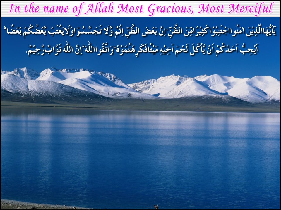 Shuru Allah k Naam se: un Iman daar Mardon aur Aourton se Allah ne un Jannaton ka Wada Farmaya hai jin k Neeche Nahre Lahre le rahi hai Jaha wo Hamesha hamesh rahne wale Hai aur un saaf Suthre Pakiza Mohllaat ka jo un hameshgi wali jannaton me hai, aur Allah ki Raza mndi sub se Badi cheez hai, yahi Zabrdst kamiyabi hai.(Surah:Al-Tawbah, Surah No:9, Aayat No:72)